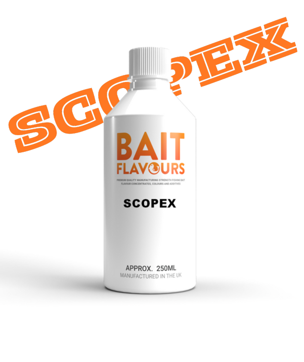 Scopex: Discover the timeless appeal of Scopex with Bait Flavours' signature fishing bait flavour concentrate. Carefully formulated by some of the UK's top flavour chemists, our Scopex offers a unique blend of sweet, sour and creamy notes, designed to trigger a feeding response among the most elusive fish. Crafted with manufacturing strength potency, each 10ml bottle can potentially flavour up to 5kg of solid bait with just 0.2% or 2g per kilo (depending on boil/ steaming times), ensuring maximum effectiveness on the water. While targeting carp and catfish, Scopex also attracts a wide variety of other species, making it a versatile choice for anglers seeking a classic, reliable flavour.