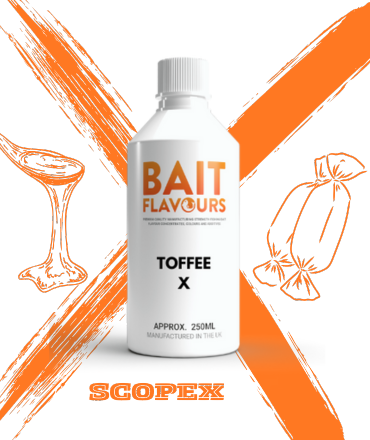 Welcome to the next evolution in flavour attraction—Toffee X, a standout from our 'X' range of premium fishing bait flavours. Combining the velvety, creamy essence of our signature Scopex with the indulgent depth of our own rich toffee, this flavour profile is both comforting and powerfully effective with its warm, buttery appeal. As with all our concentrates, each 10ml bottle can potentially flavour up to 5kg of solid bait with just 0.2% or 2g per kilo (depending on boil/steam times), ensuring a potent attractant with minimal usage.